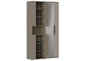 Разделение на секции: Одна часть прихожей включает две одинаковые секции с полками, закрытые створками. В каждой секции предусмотрено по две съёмные полки, что позволяет настраивать пространство под ваши нужды. Открывание створок осуществляется за выступ, что делает использование шкафа более удобным.