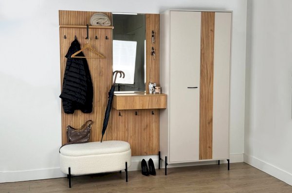 Принт, имитирующий вертикальную фрезеровку придает вешалке уникальный и современный вид, добавляя текстуру и глубину. Материал вешалки – ЛДСП, что обеспечивает прочность и долговечность, а также легкость в уходе.